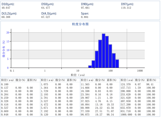 1. 白剛玉W60的標準規(guī)格是W63,60-63微米,對應日標#280白剛玉,其D50中值為63-64微米。它的篩分方式是經(jīng)過水洗溢流或虹吸法生產(chǎn)的,雜質(zhì)少,流動性好。粒度分布如下圖: