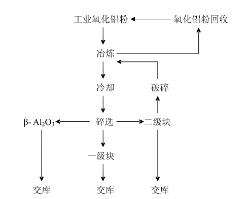由此可見,電熔白剛玉的生產(chǎn)要嚴(yán)格控制氧化鈉的含量,一般通過(guò)選用低鈉氧化鋁粉做原料,增加促進(jìn)Na2O揮發(fā)的輔助材料進(jìn)行冶煉來(lái)實(shí)現(xiàn)。具體的冶煉工藝如下圖: