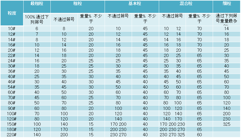 噴砂電熔氧化鋁砂的型號(hào)粒度尺寸表: